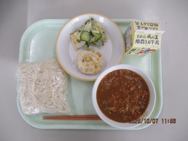 今日の献立は、ソフト面のカレーソース  白菜とリンゴのサラダ  蒸しパン  牛乳  でした。