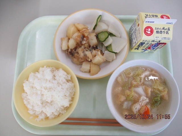 今日の献立は、ごはん ホキとじゃがいもの甘からめ みそ汁 カブの色どり 牛乳 でした。