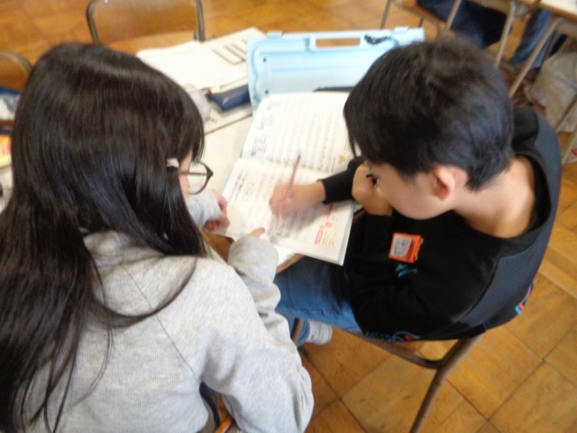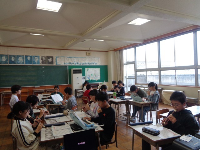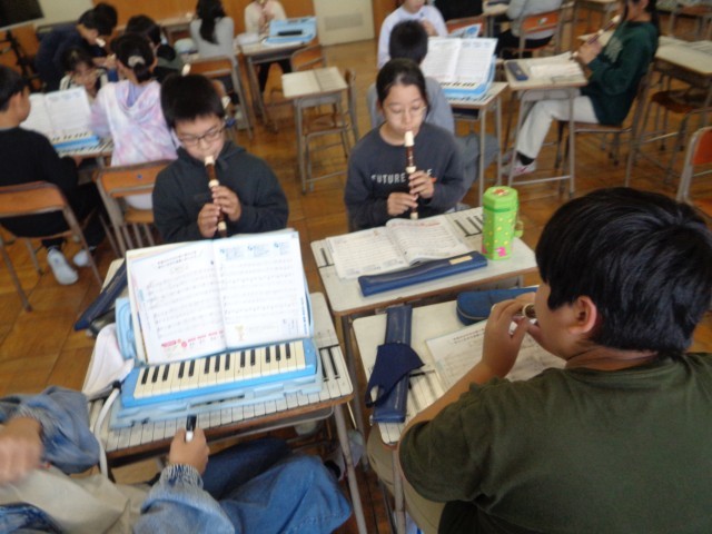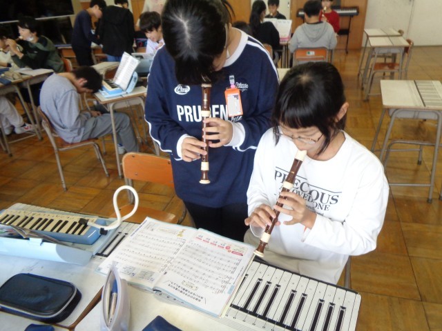 6年生の音楽科の学習の様子です。「雨の音」を各グループで合奏するために練習しました。タイミングやリズムが分からない人は、前のCDプレイヤーの前で音を合わせました。さらに、リコーダーの指の動き等を教え合う姿が見られました。