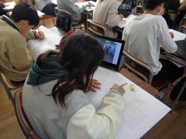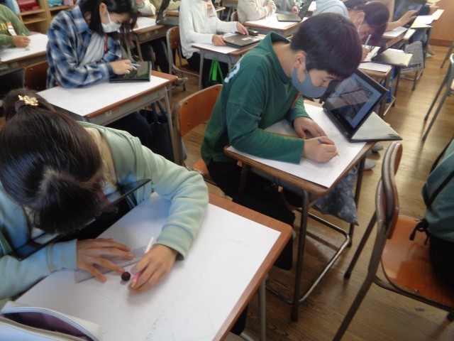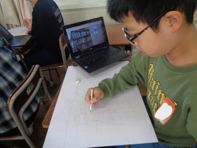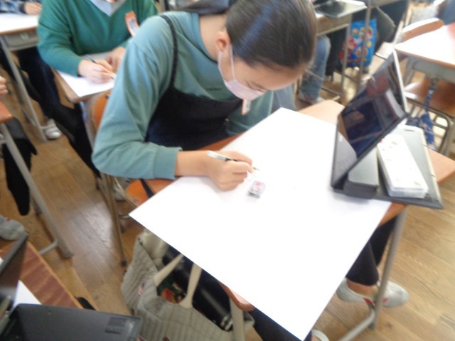 6年生の図画工作科の学習の様子です。大久保小学校での思い出を描きました。写真をよく見て、立体感を意識して描きました。