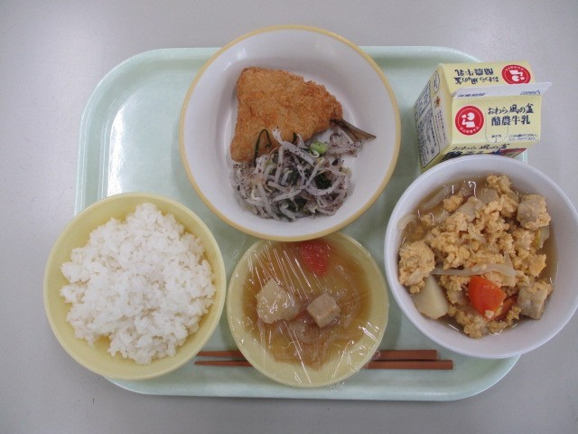 今日の献立は、ごはん 卵とじ あじフライ ゆかり和え 牛乳 でした、
