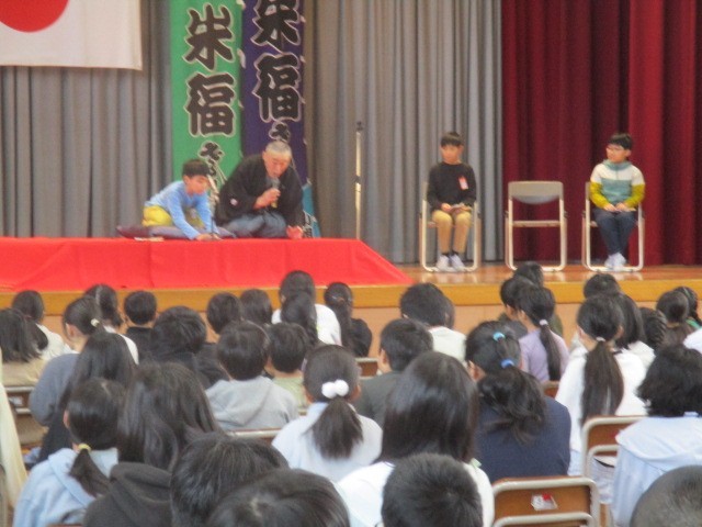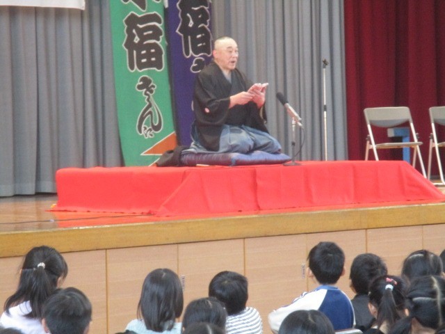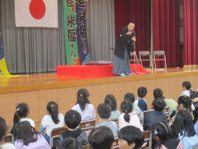 落語家の桂米福さんをお招きし、落語体験教室を行いました。扇子・手ぬぐいといった小道具の使い方を教わったり、児童の代表が舞台に上がりダジャレを話したりする体験も行いました。表現豊かで、思わず引き込まれてしまう話し方に夢中。笑いの渦に包まれた落語体験となりました。