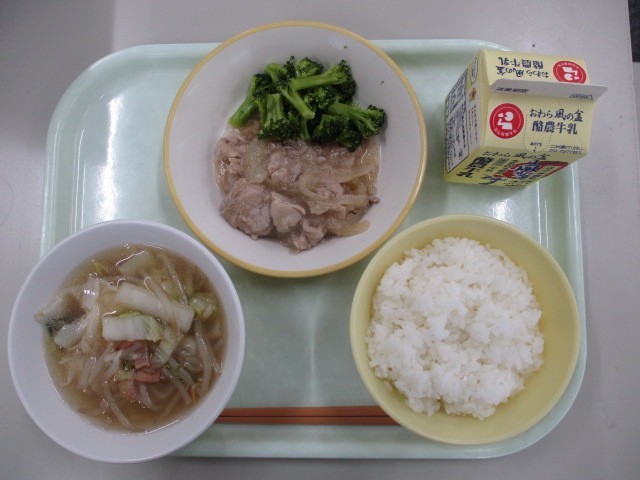 今日の献立は、 ごはん  豚肉のおろし炒め  ワンタンスープ  ゆでブロッコリー  牛乳  でした。