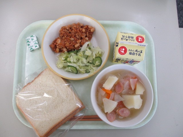今日の献立は、 食パン チリコンカン 野菜のスープ煮 添え野菜 ポケットチーズ 牛乳 でした。