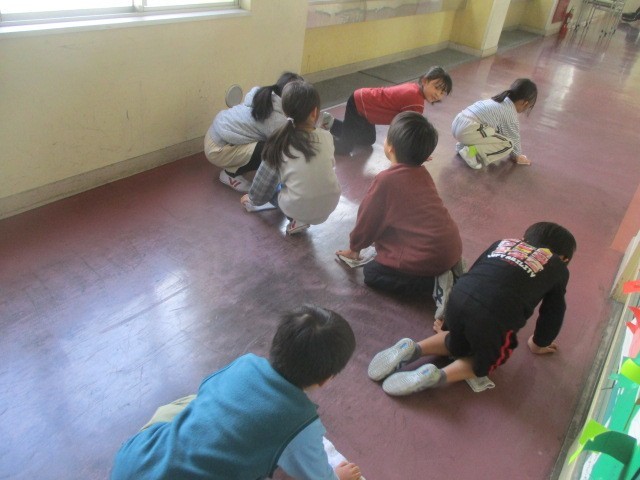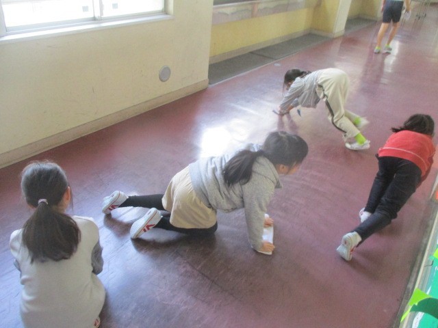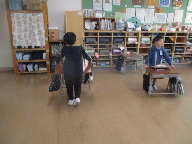 教室と、教室前の廊下を掃除している様子です。雑巾がほこりだらけになるほど一生懸命雑巾がけをしたり、たくさん机を運んだりしている姿が見られました。
