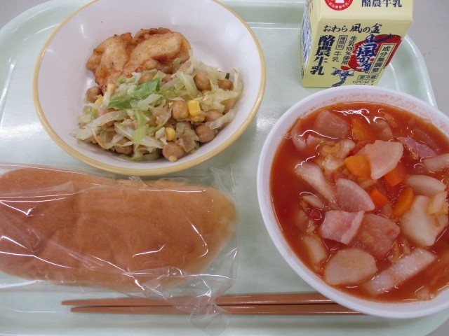 今日の給食は、コッペパン、ポークフリッター、ひよこ豆のサラダ、野菜のトマトスープ煮です。