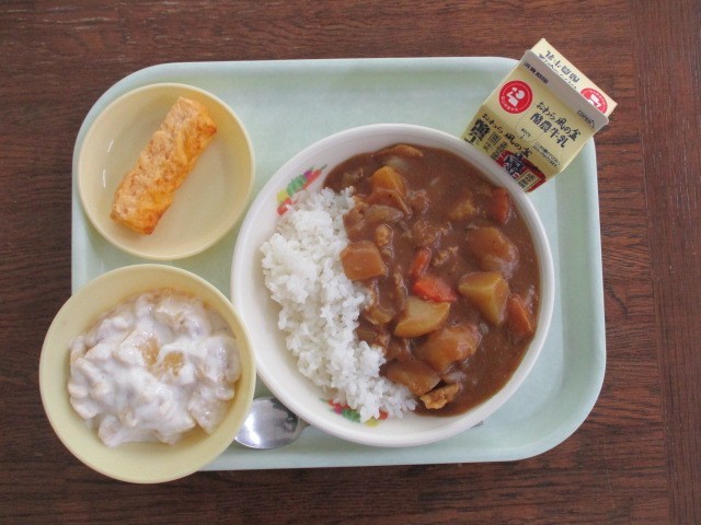 今日の献立は、 カレーライス 卵ロール フルーツヨーグルト 牛乳 でした。
