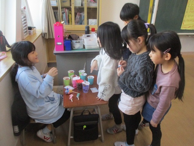 今日は、集会係さんたちが企画した「お楽しみ集会」を開きました。「お祭りをしたい」という考えから、たこ焼きやタピオカドリンク等、屋台で売られていそうな食べ物を、一生懸命作って準備を進めていました。今日はみんなお祭り気分で屋台を回っている姿が見られ、見ているこちらも楽しくなりました。また、体育館ではドッジボールやはんかち落としをする等、今回の集会はすることが盛りだくさんで、とても楽しそうでした。