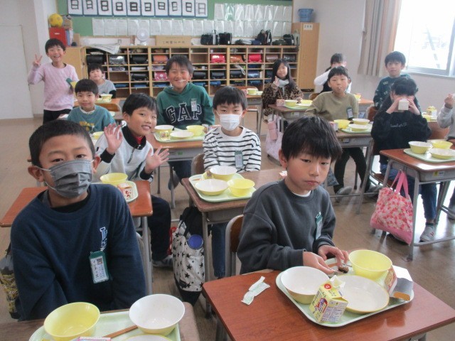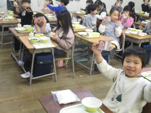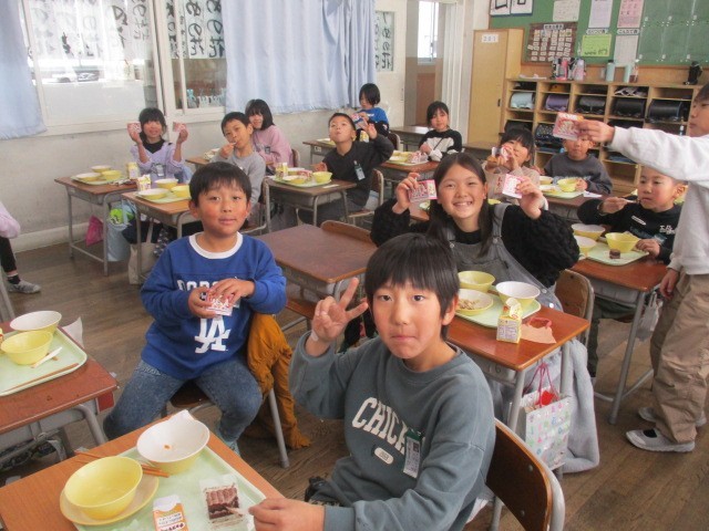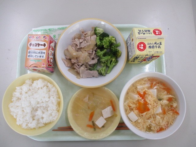 2学期最後の給食は、お楽しみ献立として、チョコケーキがメニューに登場しました。朝から、心待ちにしていた子供たちもたくさん見られ、美味しくいただきました。その他の献立は、ご飯 豚肉のジャンロー かきたま汁 ゆでブロッコリー 牛乳 でした。