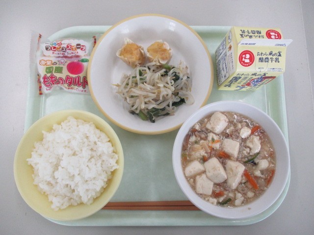 メニューは、ご飯 マーボー豆腐 にんじんシューマイ 塩ナムル 桃タルト 牛乳 でした。