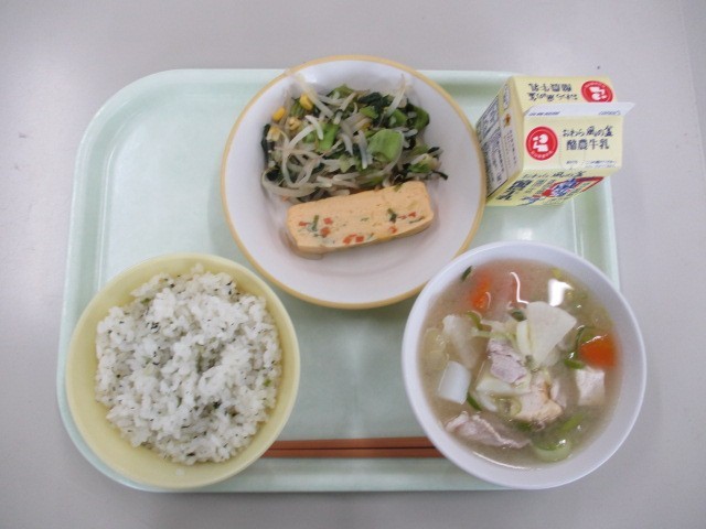 今日の献立は、菜めし 豚汁 千草焼き チンゲンサイソテー 牛乳 でした。