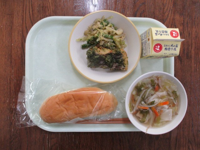今日の献立は、コッペパン  ワンタンスープ  ホキの磯辺揚げ  アスパラガスのごまだれ  牛乳  でした。