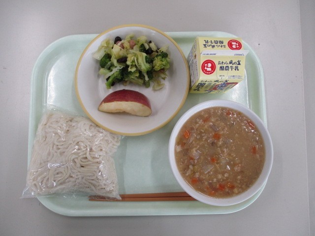 今日の献立は、 ソフト麺肉みそ味 ビーンズサラダ リンゴ 牛乳 でした。