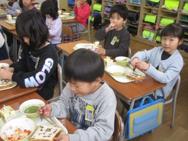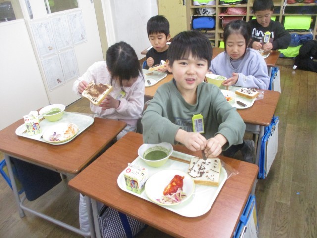 月曜日の給食ではチョコペンで食パンを彩りながら食べました。