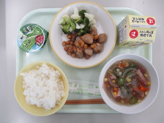1月30日(金)今日の給食 公開日 2026/01/30 更新日 2026/01/30 給食室から 「学びをぱくり! おいしい教科書」最終日。今日のテーマは「音楽」です。メニューは、ご飯 豚肉と豆のマスタードソースからめ きらきら星スープ 花野菜サラダ お茶プリン 牛乳 でした。