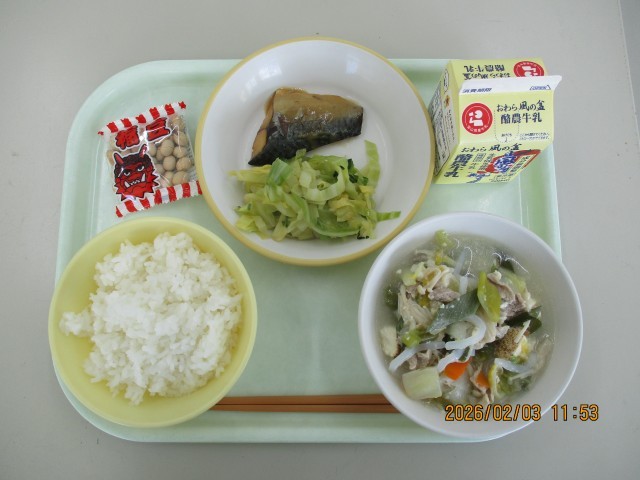 今日の献立は、ご飯  塩こうじ鍋  さばの味噌煮  おひたし  節分豆  牛乳  でした。