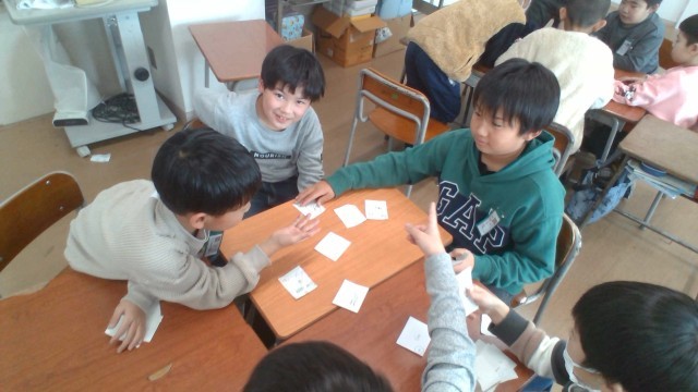 先日の授業で作成したオリジナルのカルタで楽しみながら漢字に触れていました。