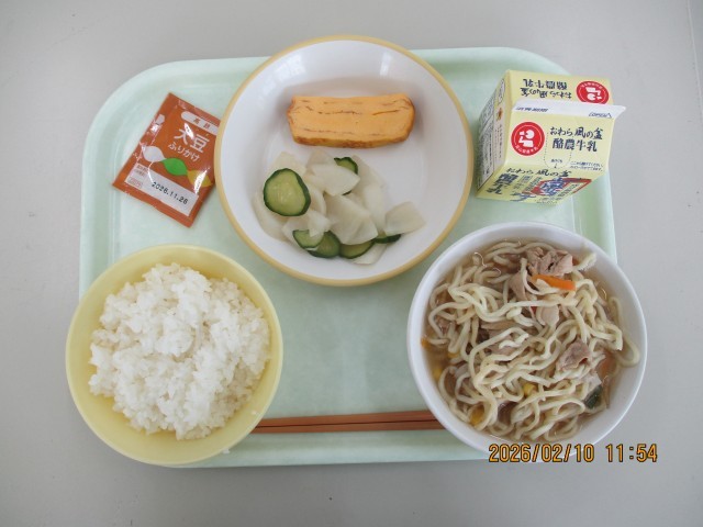 今日の献立は、 ごはん サッポロラーメン 厚焼き卵 かぶの色どり 大豆のふりかけ 牛乳 でした。