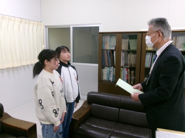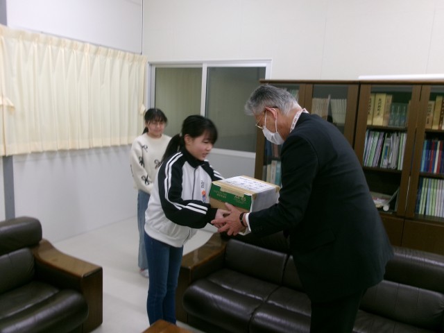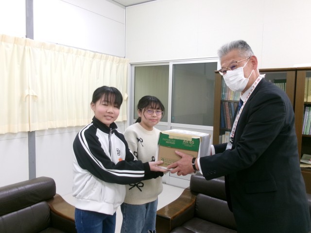 2月に全校の皆さんが持ってきてくださった募金を、大沢野地域共同募金委員会の方にお渡ししました。