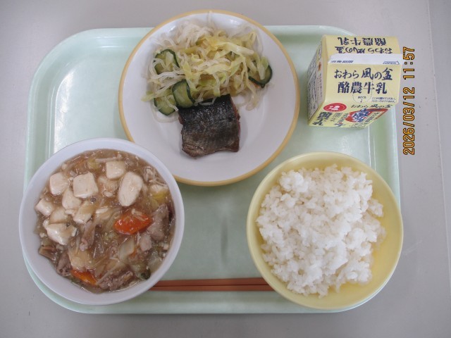 今日の献立は、ご飯 豆腐の野菜あんかけ にしんの生姜味 バンサンスー 牛乳 でした。