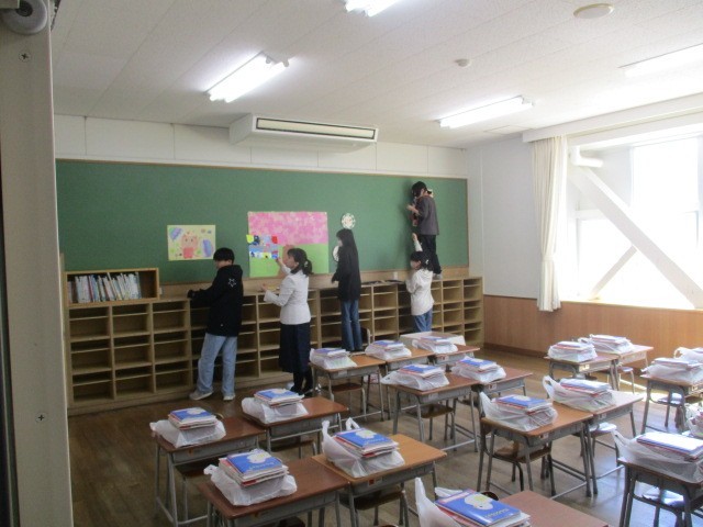 1~5年生が帰った後、6年生が残って再び明日の入学式の準備をしてくれました。どんどん準備が整っていきました。6年生さん、ありがとうございました。これで、明日、85名の1年生さんを迎えることができそうです。