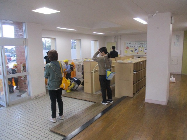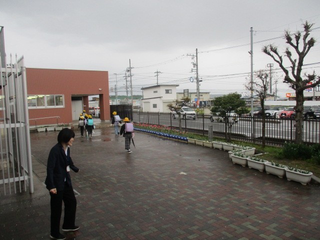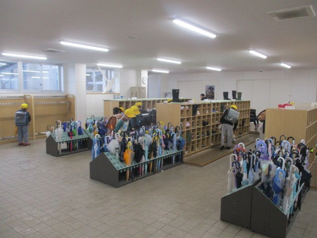 今朝の児童玄関の様子です。雨の朝です。初めて合羽を脱ぐのに悪戦苦闘している人もいましたが、子供たちの挨拶は、とっても元気でした。