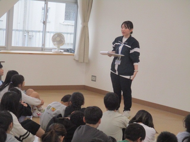 5年生は、1時間目に3クラスが集まっていました。1年間の見通しについて確認していました。