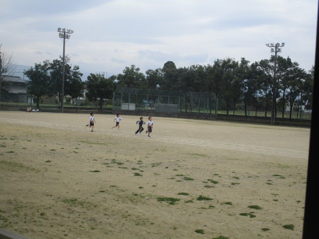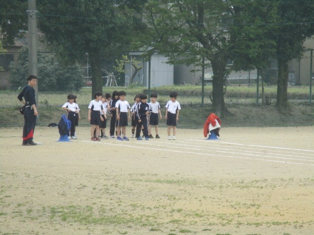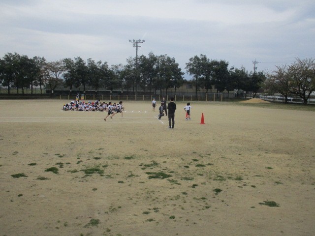 2年生は、3クラス合同で、2時間目にグラウンドで体育科の学習をしていました。50m走をはかっていました。