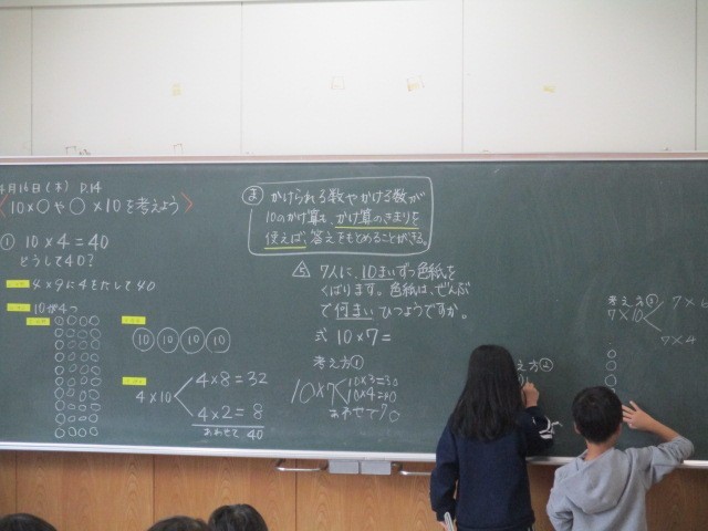3年2組の1時間目は、算数科の学習でした。10×〇や〇×10について考えていました。