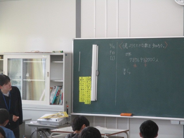4月16日(木) 4年2組 7876932000人 公開日 2026/04/16 更新日 2026/04/16 4年生 4年2組の5時間目は、算数科の学習でした。7876932000人を漢数字でかいてみるみたいです。