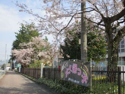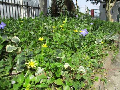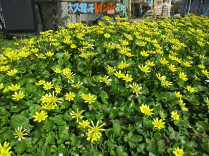 あたたかな日ざしの下、花がいっぱい咲いています。