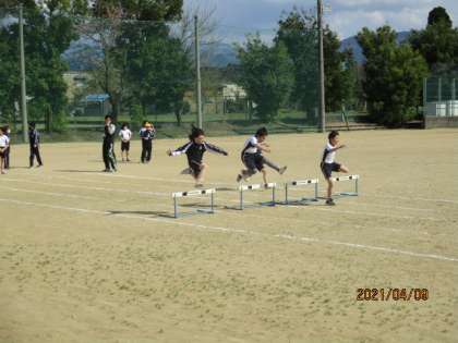 9日午後、6年生体育「ハードル走」、3年生理科「春の自然にとびだそう」を学習していました。今日は一日天気のよい日で、たくさんの学年が外で活動しました。