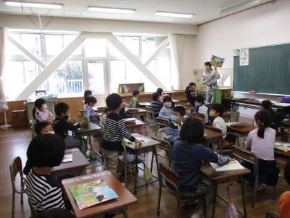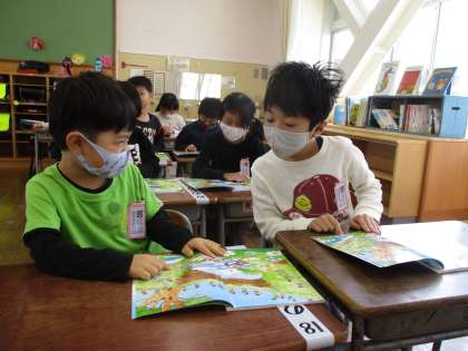 絵の中に何が書いてあるか探したり、見つけたことを発表したりしました。友達といっしょに楽しく見つけることができました。発表を聞くときには、友達の方を見て静かに聞きました。