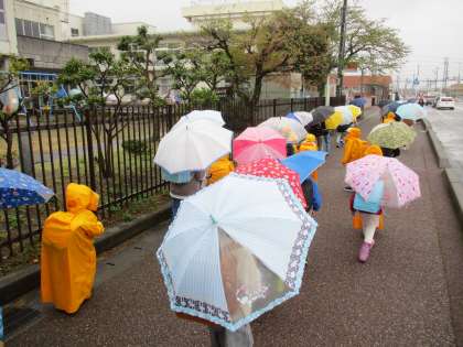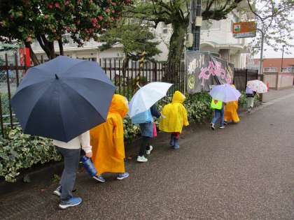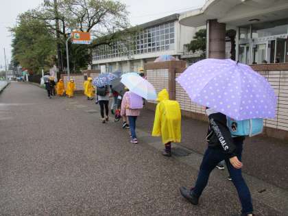 また、カッパを着ていると視野がせまくなります。周囲をよく確認しながら交通事故にあわないように気を付けて登校しましょう。ご家庭でも安全な登校についてお話をしてあげてください。