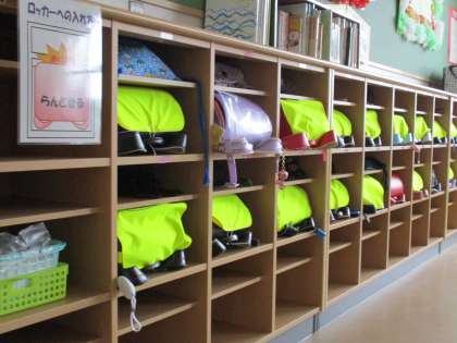 ランドセルが整然と並んで整頓されています。