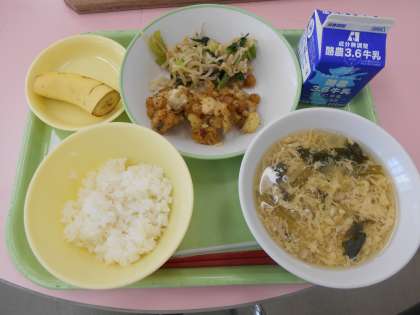 4月15日(木)の献立は、ごはん・牛乳・魚と豆のえごまみそからめ・おひたし・かき玉汁・バナナでした。