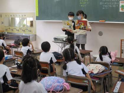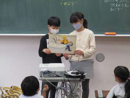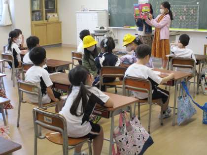 6年生が、紙芝居をしたり朝の整頓を手助けしたりしています。