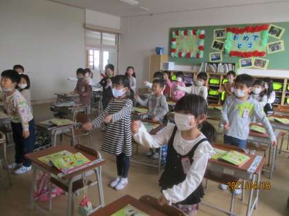 4月16日(金) 1年生 音楽 公開日 2021/04/19 更新日 2021/04/19 2023年度 1年生 今日は初めて音楽の授業をしました。 教科書の中から見つけた「ちょうちょう」や「いぬのおまわりさん」などを歌ったり、歌に合わせてリズムをとったりしました。 授業後は「楽しかった。」「家でもお父さんと歌ってみる。」と言っている子もいました。