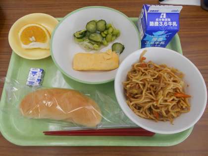 4月19日(月)今日の献立は、減量コッペパン・牛乳・焼きそば・卵ロール・枝豆のマリネ・甘夏みかん・ポケットチーズでした。