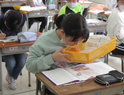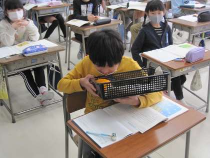 国語「白いぼうし」に出てくる夏みかん。イメージを膨らませるために、甘夏みかんを用意しました。「今は食べられなくて残念だな」とつぶやく子供たちでした。