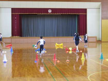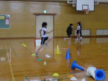 体育館にてハードル走のポイントを確認しました。踏み切る距離、空中の姿勢、ハードル間の歩数などを考えて練習する子供たちです。