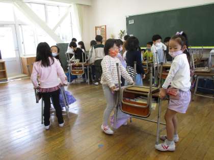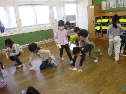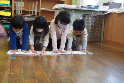 机を引きずらないように、2人で机を持ち上げて運んだり、ぞうきんでほこりを取ったり、積極的に掃除をする姿が見られました。