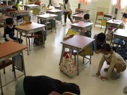 4月23日(金) 2年生 掃除 公開日 2021/04/23 更新日 2021/04/23 2023年度 2年生 濡らした雑巾で床を磨きます。自分の机の周りの掃除が終わったら、友達の手伝いをしている人がいました。素敵です。