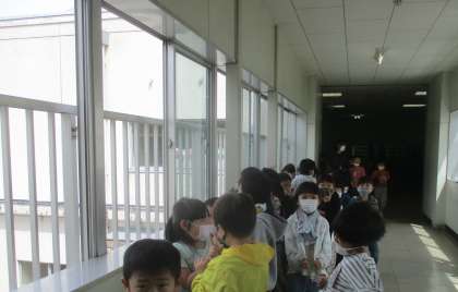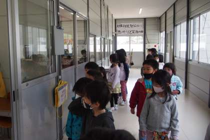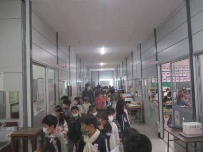 初めて行く仮設校舎や家庭科室前、職員室前に心を弾ませながら、楽しく学校を回っていました。