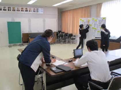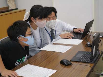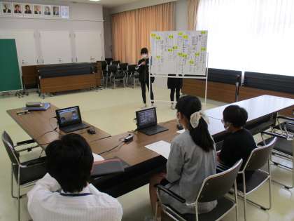 感染症拡大防止のため、会議室と各教室をつないだ「リモート児童総会」です。
