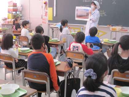 給食の時間に、栄養士さんが話をしに来てださいました。給食センターから給食が運ばれてくる話を聞き、改めて感謝しおいしくいただく姿が見られました。