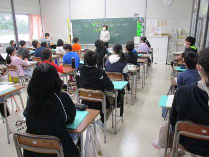 写真は、1組の家庭科の授業の様子です。高学年の家庭科の授業を一人の先生が担当します。