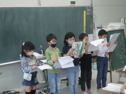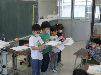 5月7日(金) 2年生 音読発表会 公開日 2021/05/10 更新日 2021/05/10 2023年度 2年生 今日は4月から音読練習してきた「ふきのとう」の音読発表会をしました。声の強弱や動きを意識して読んでいました。練習の成果が出ていました。