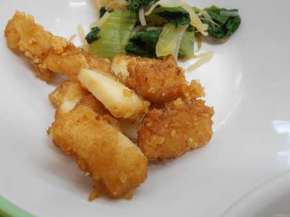 今日のかりん揚げは、しょうゆとカレー粉を混ぜ合わせたものを、いかにつけ込んみ、でんぷんを付けて油で揚げてあります。香ばしくておいしかったです。かりん揚げの「かりん」は、油で揚げたときの色が黄色っぽくて、植物のかりんの色に似ているからという説、お菓子のかりんとうに似ているからという説があるそうです。