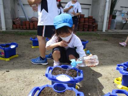 その後、鉢に土を入れ、種をまきました。水もたくさんあげました。